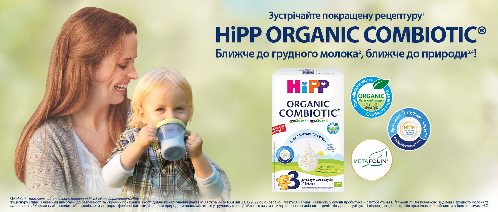 Так, суміші HiPP Organic Combiotic® містять не звичайну синтетичну фолієву кислоту, а Mеtafolin® - активну форму фолієвої кислоти, яка важлива для нервової системи, кровотворення, росту і розвитку дитини. HiPP – єдиний виробник на території України, який має Metafolin® у складі дитячих сумішей.
