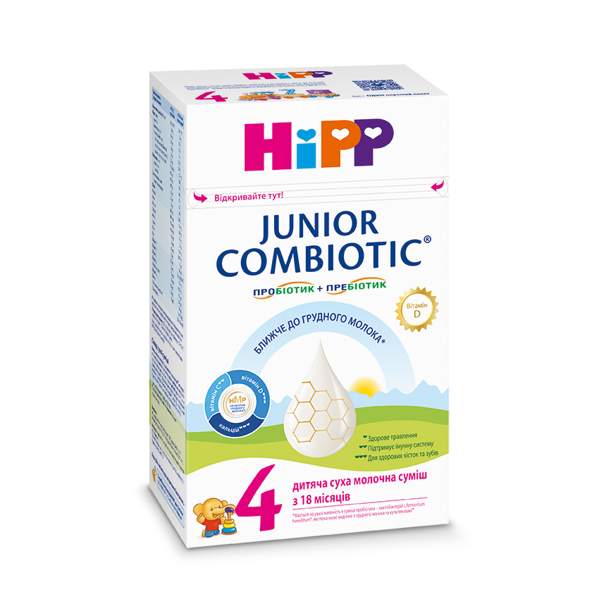 ереходили на HiPP JUNIOR COMBIOTIC® 4 після попереднього етапу цієї ж серії — адаптація пройшла легко і без проблем. Суміш добре засвоюється, немає здуття чи алергічних реакцій. Приємний смак — малюк п'є з задоволенням, навіть просить добавку