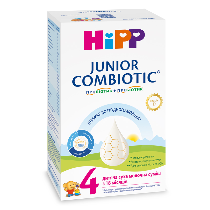 ереходили на HiPP JUNIOR COMBIOTIC® 4 після попереднього етапу цієї ж серії — адаптація пройшла легко і без проблем. Суміш добре засвоюється, немає здуття чи алергічних реакцій. Приємний смак — малюк п'є з задоволенням, навіть просить добавку