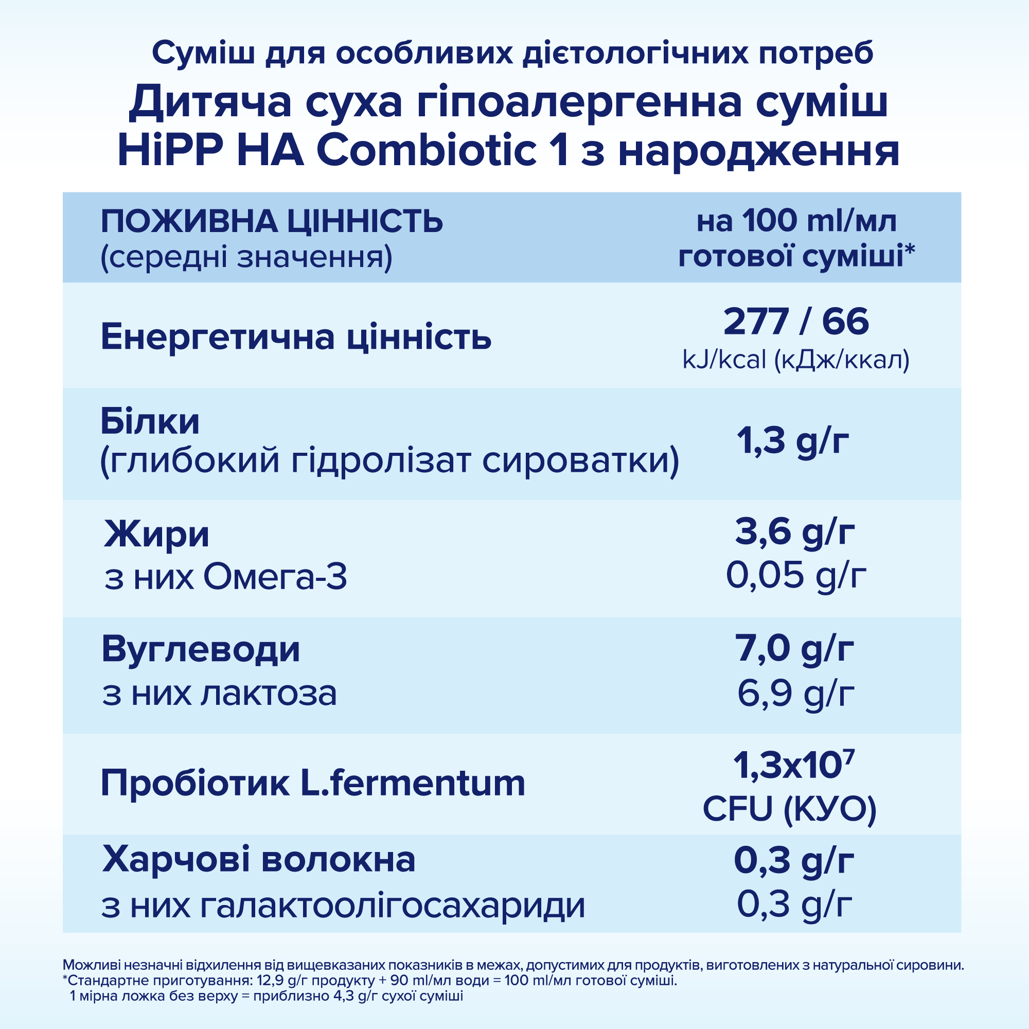 лактоза, рослинні олії (пальмовий олеїн*, низькоєрукова ріпакова, соняшникова), гідролізат білків молочної сироватки, галактоолігосахариди з лактози, кальцію ортофосфат, калію хлорид, ефіри лимонної кислоти моно- і дигліцеридів жирних кислот, риб’ячий жир1 , холін, калію гідроксид, натрію гідроксид, L-фенілаланін, L-тирозин, рослинна олія з Mortierella alpina, кальцію карбонат, магнію карбонат, натрію селеніт, вітамін C, цинку сульфат, L-триптофан, L-гістидин, інозитол, калію йодат, L-карнітин, заліза сульфат, молочнокислі лактобактерії (L.fermentum hereditum®2 ), пантотенова кислота, ніацин, вітамін E, міді сульфат, вітамін B2, вітамін B1, вітамін A, вітамін B6, марганцю сульфат, кальцій-L-метилфолат3 , вітамін K, D-біотин, вітамін D, вітамін B12.