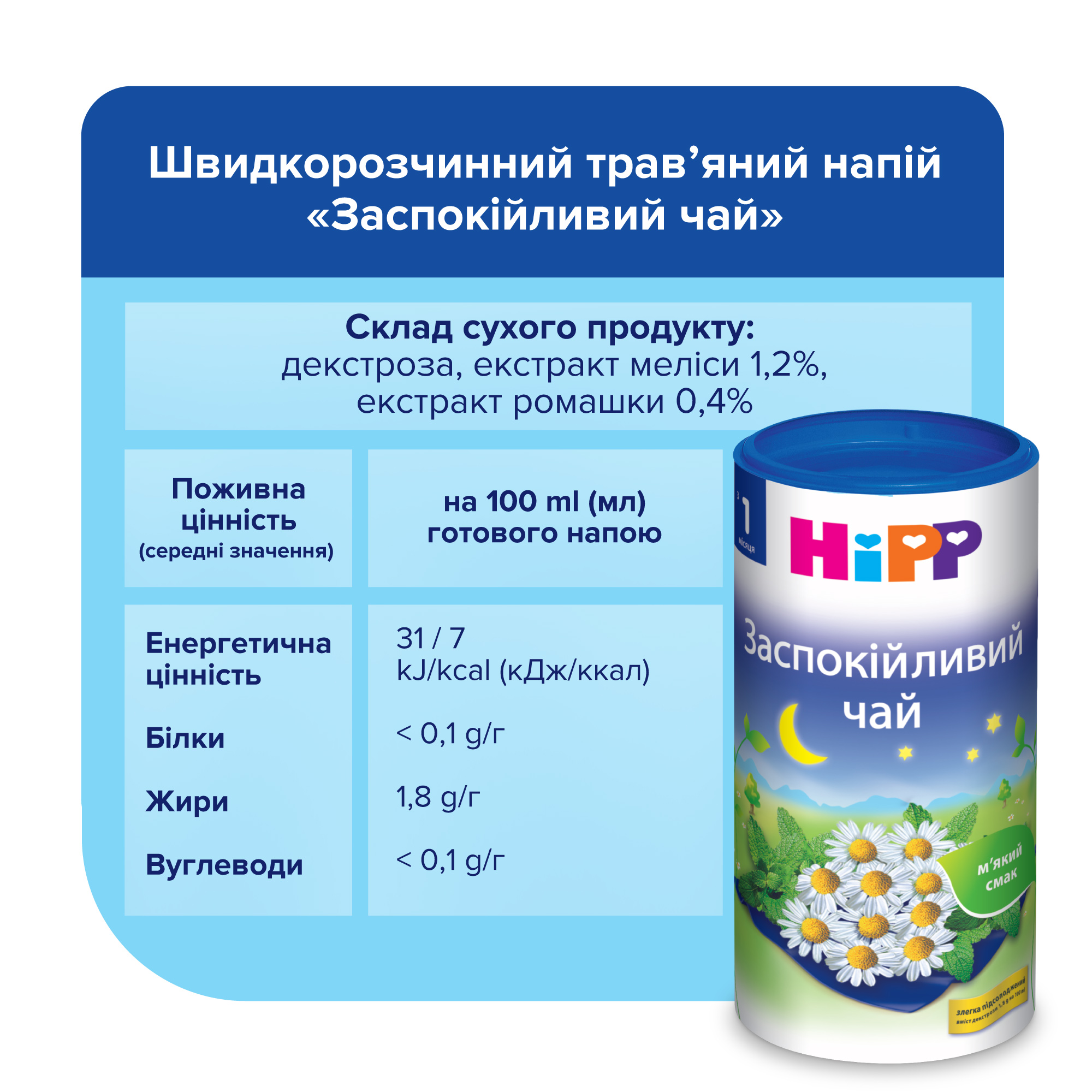Купляла заспокійливий для дітей, а й сама не витримала і підсіла на чудесний заспокійливий чай з ромашкой від hipp. Чай має дуже добрий заспокійливий ефект. Найменший крім крудного молока нічого нехоче, а ось чай п'є дуже добре. Чай неймовірно вкусний і корисний. Нам допоміг пережити період коліків з легкістю. В складі тільки Декстроза і ромашка. Чай легко заварюється, тому що гранульований.