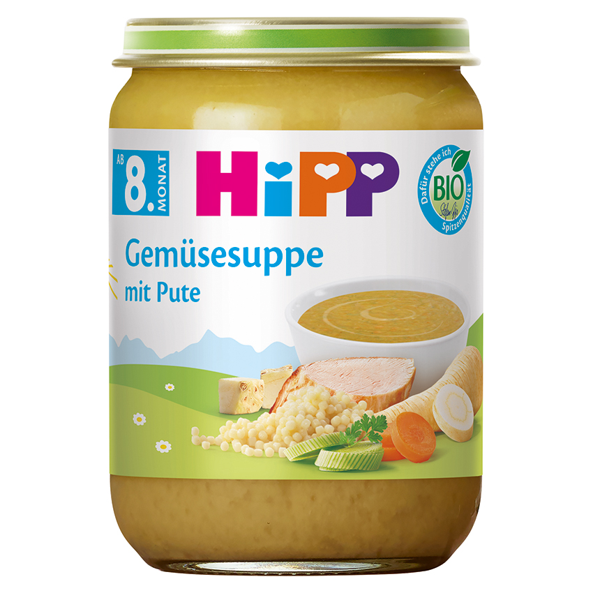 вода, органічна морква, органічне м'ясо індички 8 %, органічний пастернак, органічна селера, органічна локшина (з твердих сортів пшениці) 3 %, органічна цибуля-порей, органічна локшина подрібнена (з твердих сортів пшениці), органічна ріпакова олія 1,9 %, органічна спеція (петрушка), органічне рисове борошно.