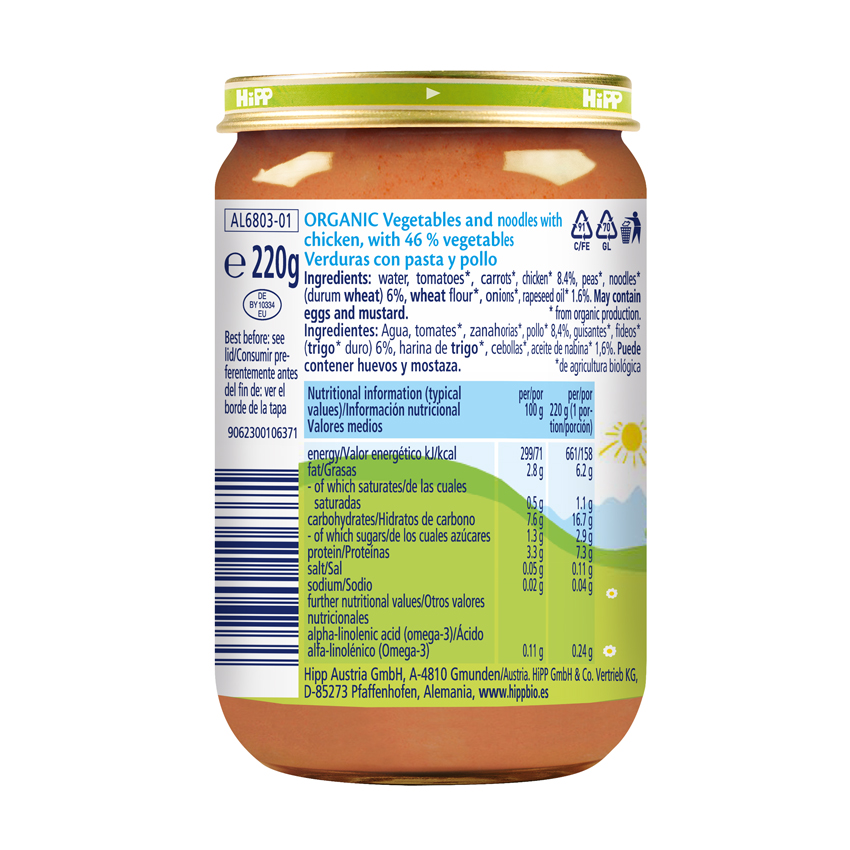 вода, органічні помідори, органічна морква, органічна курка 8,4%, органічний горох, органічна локшина (з твердих сортів пшениці) 6%, органічне пшеничне борошно, органічна цибуля, органічна ріпакова олія 1,6%.