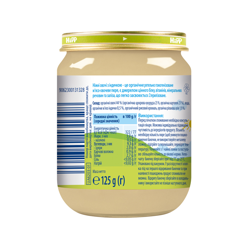 Чудове пюре, вибрали для прикорму, сподобалося поєднання інгрідієнтів, особливо індичка у складі. Дитині дуже смакує! А головне містить Омега-3 та не містить додану сіль, що сприяє здоровому розвитку дитини. Алергічних реакцій у дитини не було та засвоюється дуже добре, тому для прикорму обираємо лише продукцію HIPP!