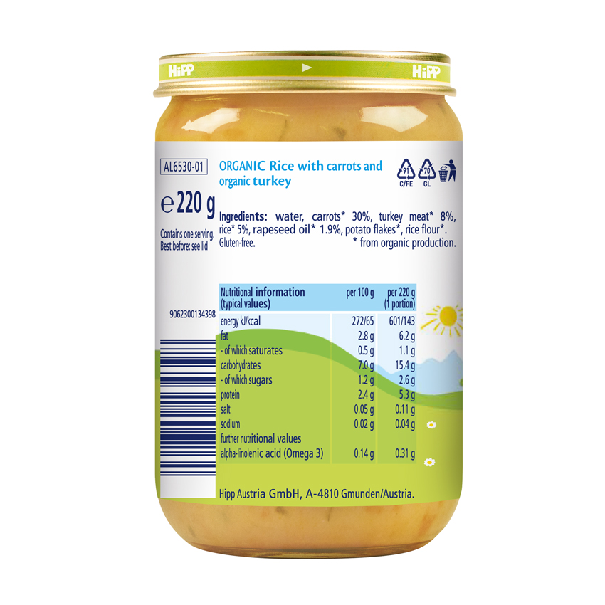 Малюк зʼїв із величезним апетитом обід з рисом та індичкою. Чудовий вибір для малюка, чудовий склад, смак, безпечні шматочки та мʼяка текстура роблять продукти Hipp моїм фаворитом серед раціонів дитячого харчування!