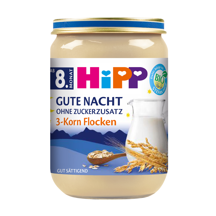 HIPP Органічна молочна каша 3 Злаки На добраніч — це відмінний продукт. Вона дуже смачна, дитина їсть її із задоволенням. Ситний склад (3 злаки) ідеально підходить для останнього годування.